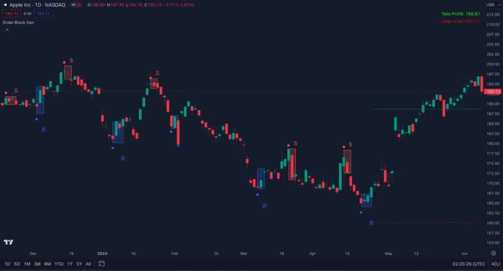 Place your stop loss just below the bullish block (for long trades) or just above the bearish block (for short trades). The indicator provides suggested stop loss levels to make this process straightforward.