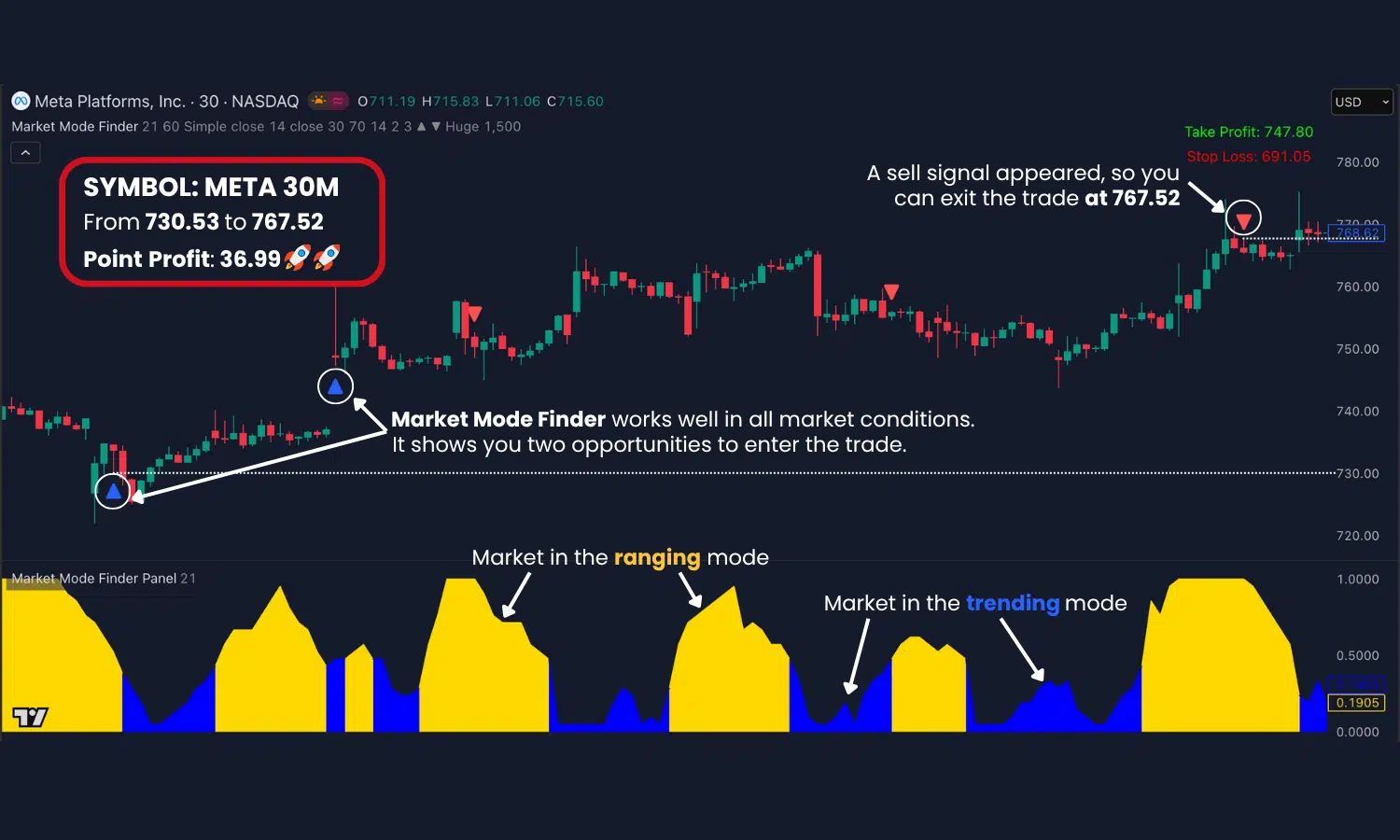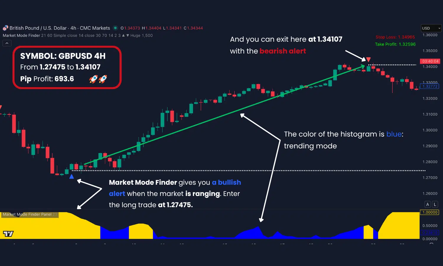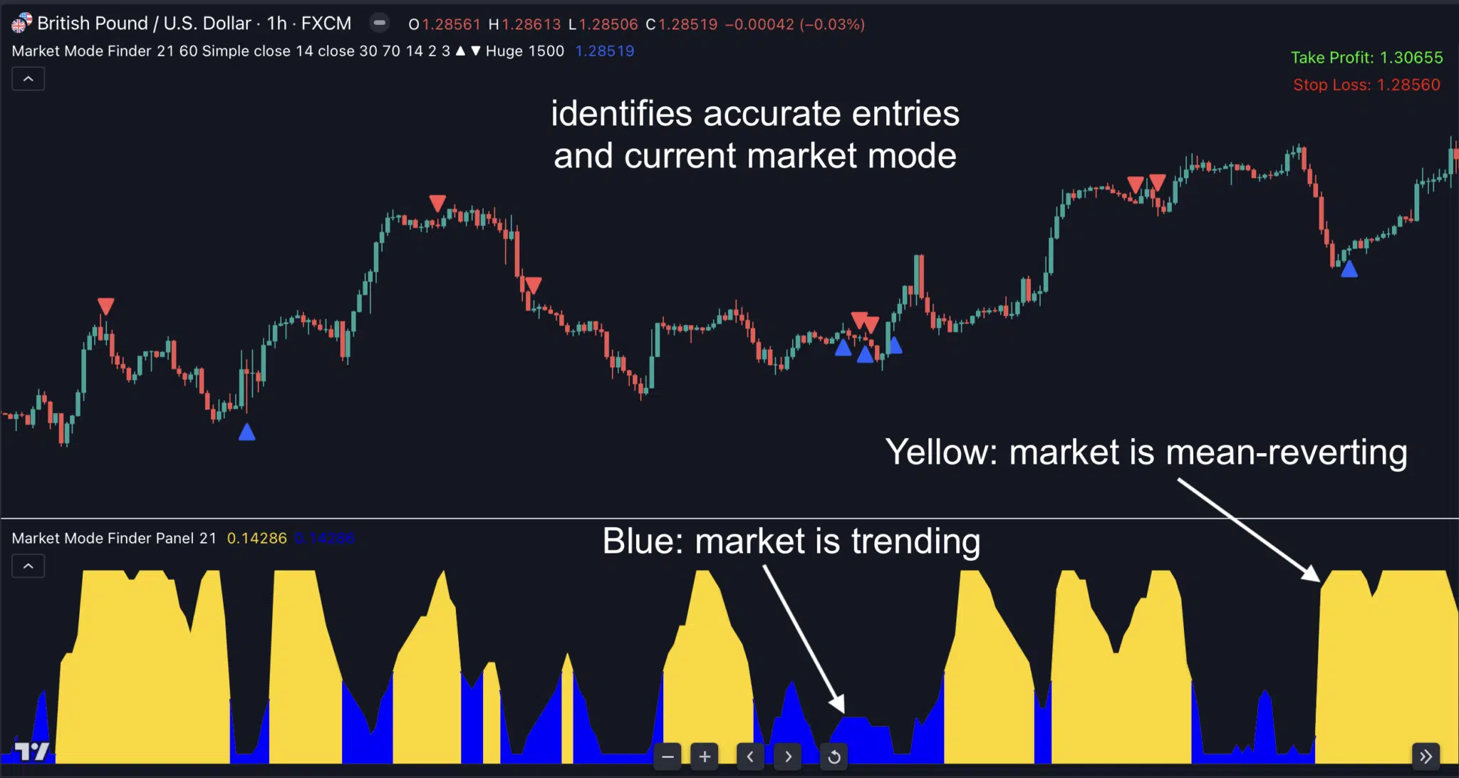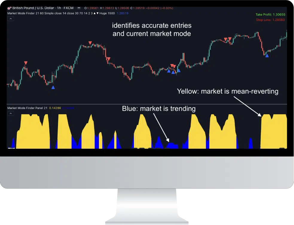 Market Mode Finder eliminates your market confusion and spots ideal setups using the right strategy in both ranging and trending markets.