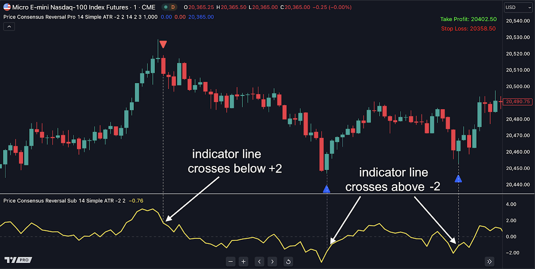 Next, Price Consensus Reversal measures your market’s volatility. It uses True Range to create a volatility factor that adjusts to changing market conditions.