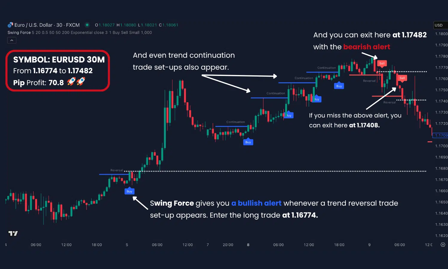 The “Swing Force for Tradingview” indicator gives you a timely alert whenever a trend continuation or trend reversal trade set-up appears.