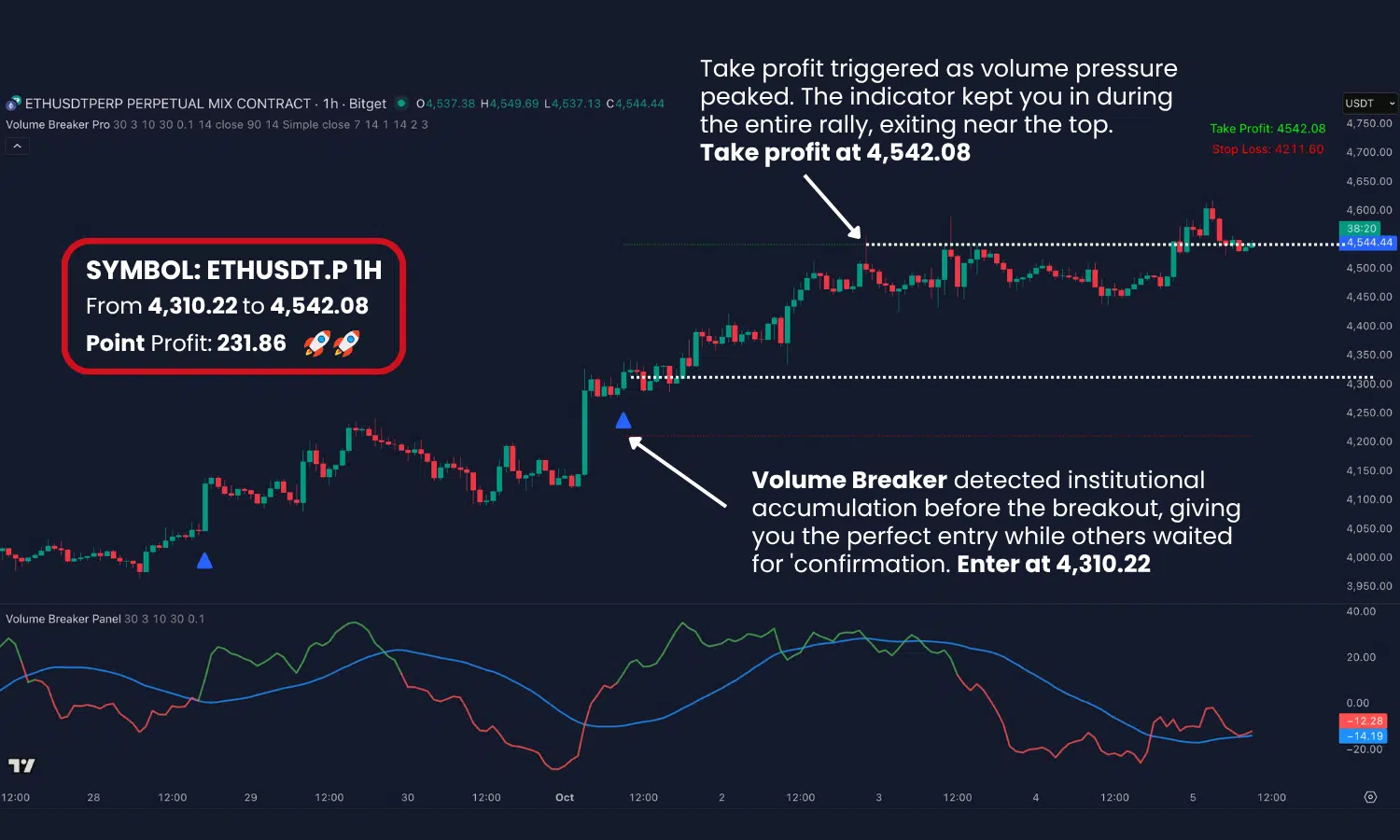 Tired of entering just as institutions are exiting? Volume Breaker detects institutional volume buildup before the move happens, so you can enter earlier and avoid false breakouts.