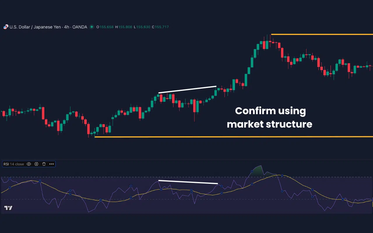 After identifying potential divergence, the trader validates the signal by examining broader market conditions such as trendlines, support and resistance level, supply and demand zones, or chart patterns.Â