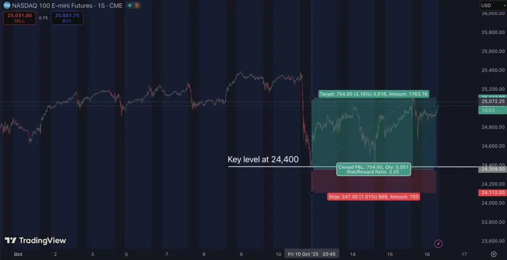 - Trade Setup: You identify a breakout above a key resistance level at 24,400. You go long (buy).