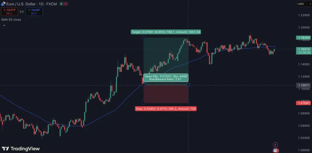- Trade Setup: You spot a strong bullish trend on EUR/USD and buy when the price pulls back to the 50-period Moving Average (MA).