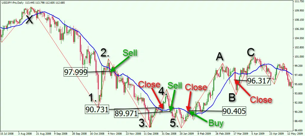 The Zig Zag indicator can also be effectively combined with the Elliot Wave technique, where traders analyze the five impulse waves and apply them to the market. By utilizing the Zig Zag indicator in this approach, traders can identify key areas to place the Elliot wave numbers, as demonstrated in the chart below.
